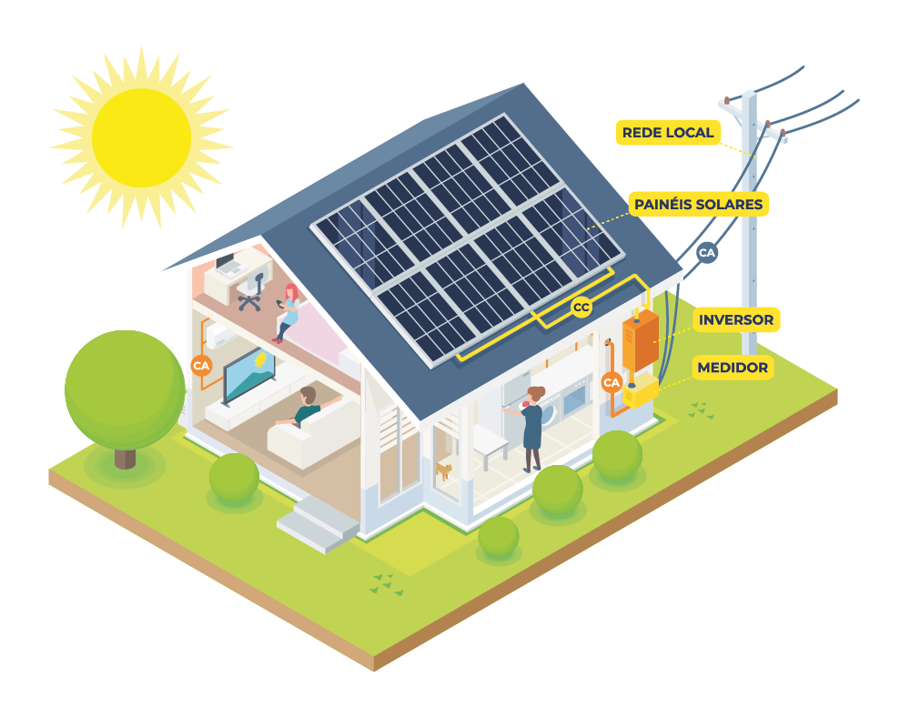 A energia gerada pode ser consumida imediatamente, após entrar no quadro elétrico da residência ou comércio.